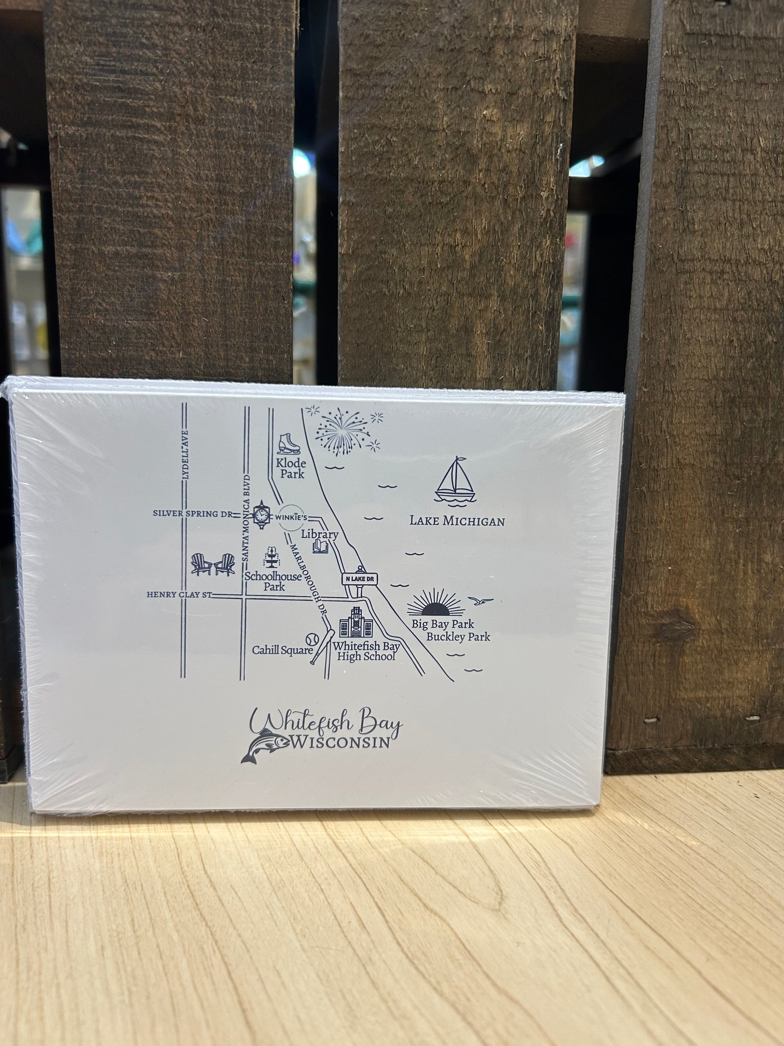 This set of notecards featuring our custom Whitefish Bay map design would make a lovely gift. Comes in mesh/canvas pouch.