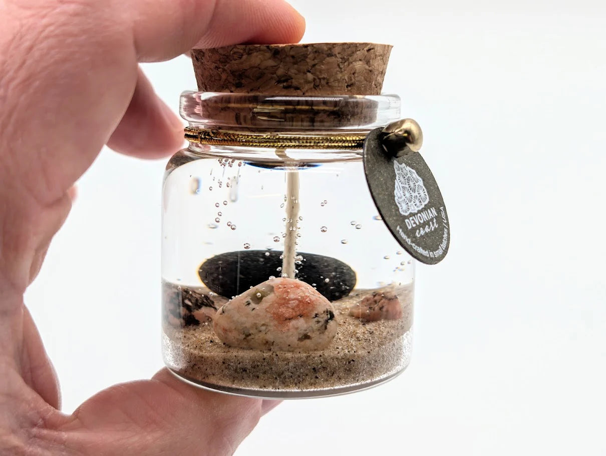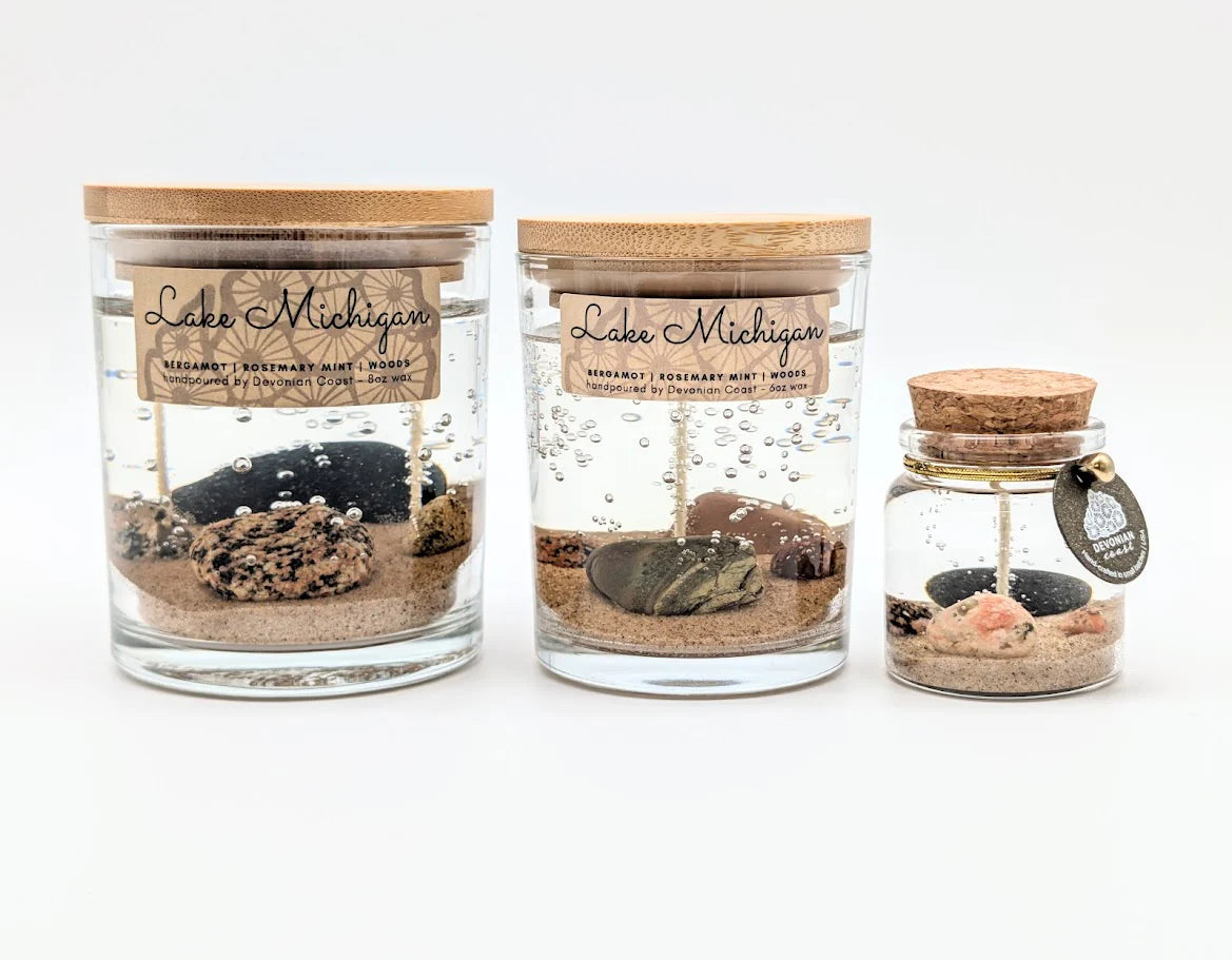 Every candle includes a printed Devonian Coast Treasure Card sharing a brief piece of natural history about the Petoskey stone inside.