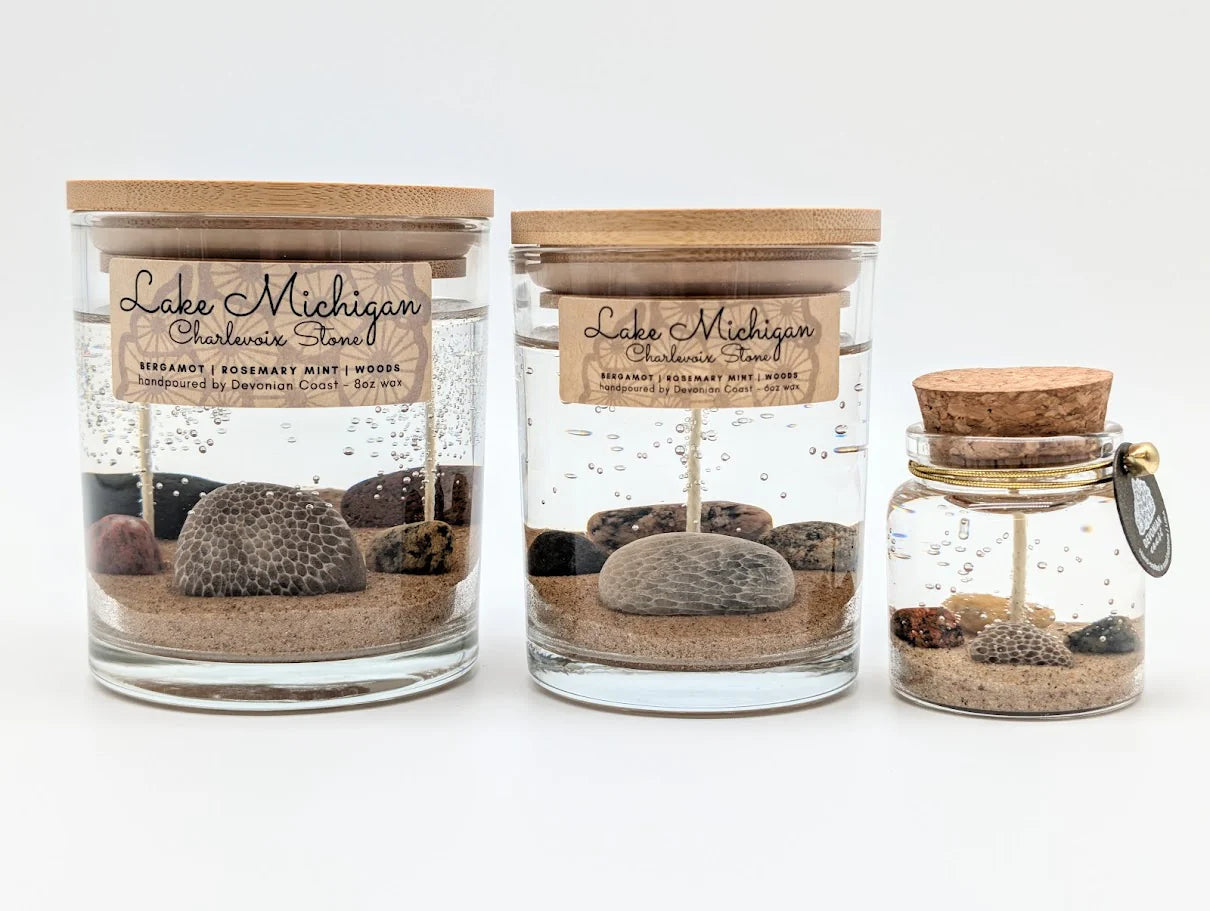 Every candle includes a printed Devonian Coast Treasure Card sharing a brief piece of natural history about the Petoskey stone inside.