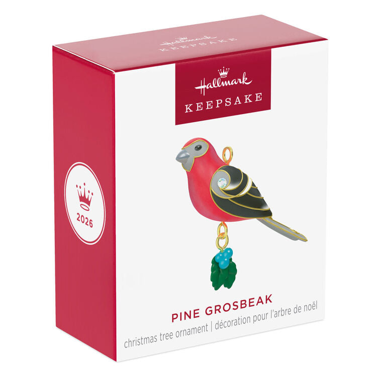 Signal the sweet songs of spring after the gentle quiet of winter with this vibrant Pine Grosbeak ornament accented with metallic gold trim and sparkling gemstones. The miniature Christmas tree ornament features a small berry charm dangling below the beautiful red and black male finch. The design makes the perfect addition to a mini tabletop tree or The Beauty of Birds Keepsake Ornament collection.